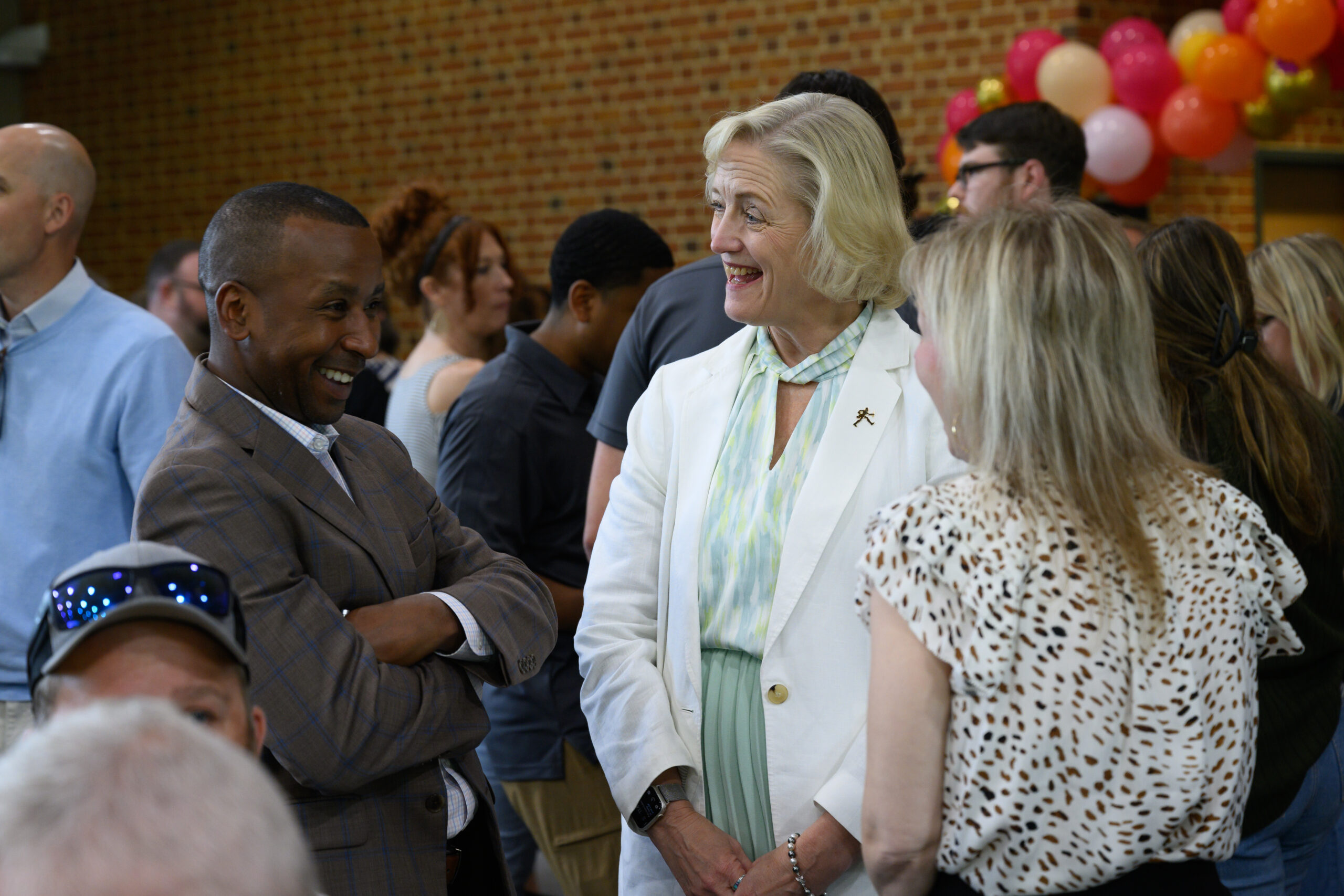 President Wente talks with colleagues during the annual Staff Appreciation Picnic in the Sutton Center on May 30, 2024.