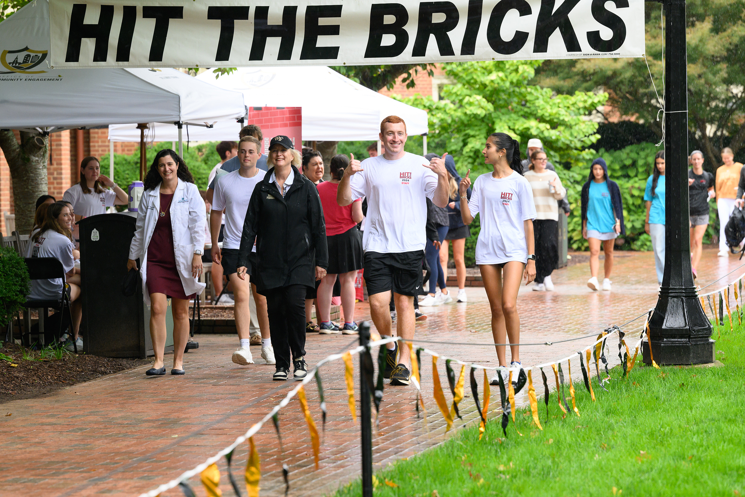 Wake Forest University faculty, staff, alumni, and students participate in Hit the Bricks on Hearn Plaza on Thursday, September 26, 2024 to raise money for the Brian Piccolo Research Fund. President Susan Wente joins student leaders for the opening lap.
