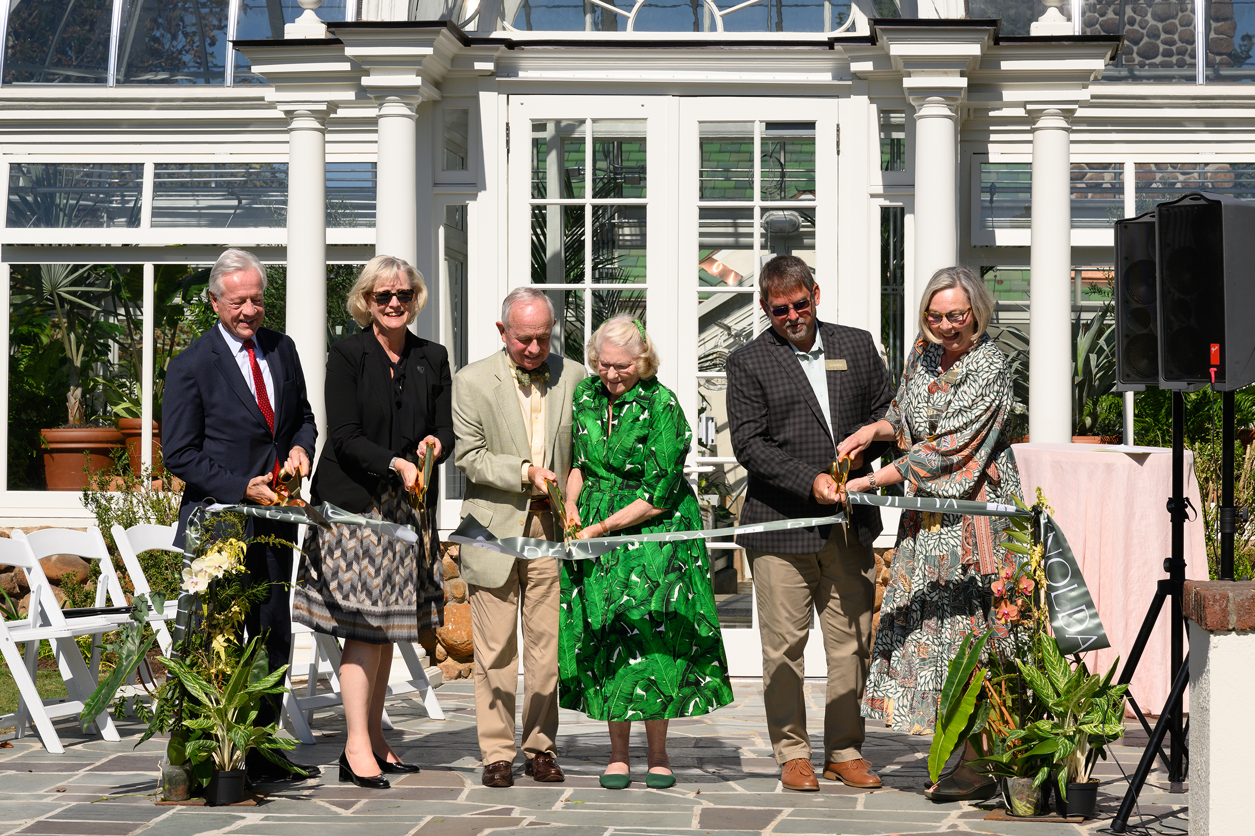 Winston-Salem Mayor J. Allen Joines, Wake Forest University President Susan R. Wente, Malcolm Brown, Patricia Brown, Director of Reynolda Gardens Jon Roethling, and Executive Director, Reynolda House; WFU Associate Provost for Reynolda House & Reynolda Gardens, Allison Perkins cut the ribbon of the newly restored Brown Family Conservatory at Reynolda Gardens on Tuesday, October 8, 2024.