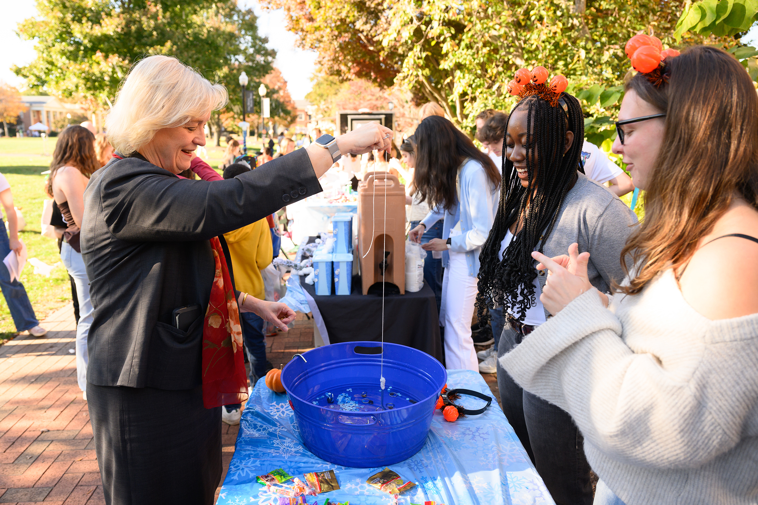 President Wente plays games on the Quad at the 37th annual Project Pumpkin, a volunteer service Halloween event, for local school children, on Hearn Plaza on Tuesday, October 29, 2024