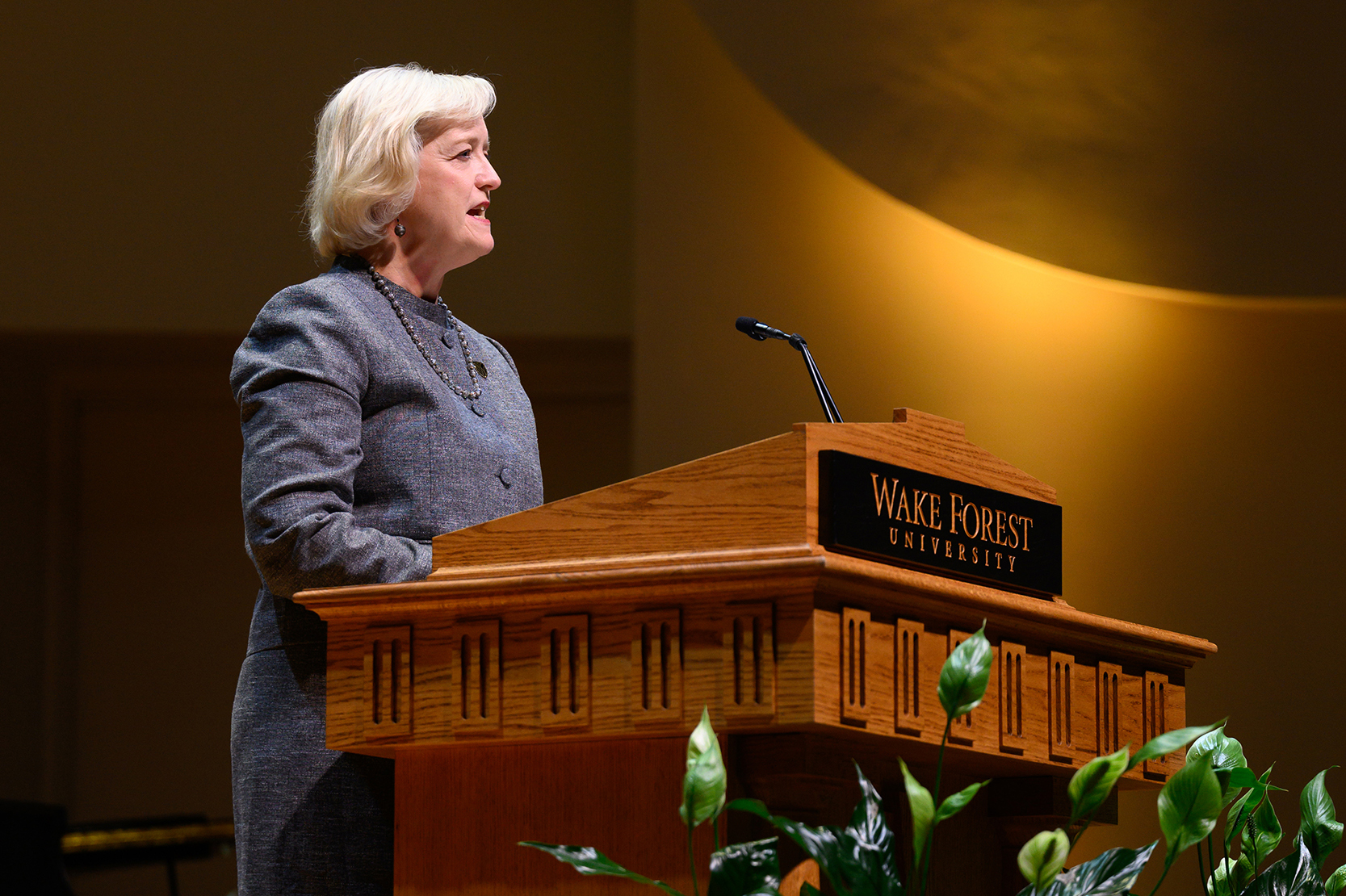 On November 19, 2021, Dr. Wente delivered her first presidential address as the 14th president of Wake Forest. In her remarks to a standing-room-only crowd, she shared about her journey of discovery, engagement, and initial observations.