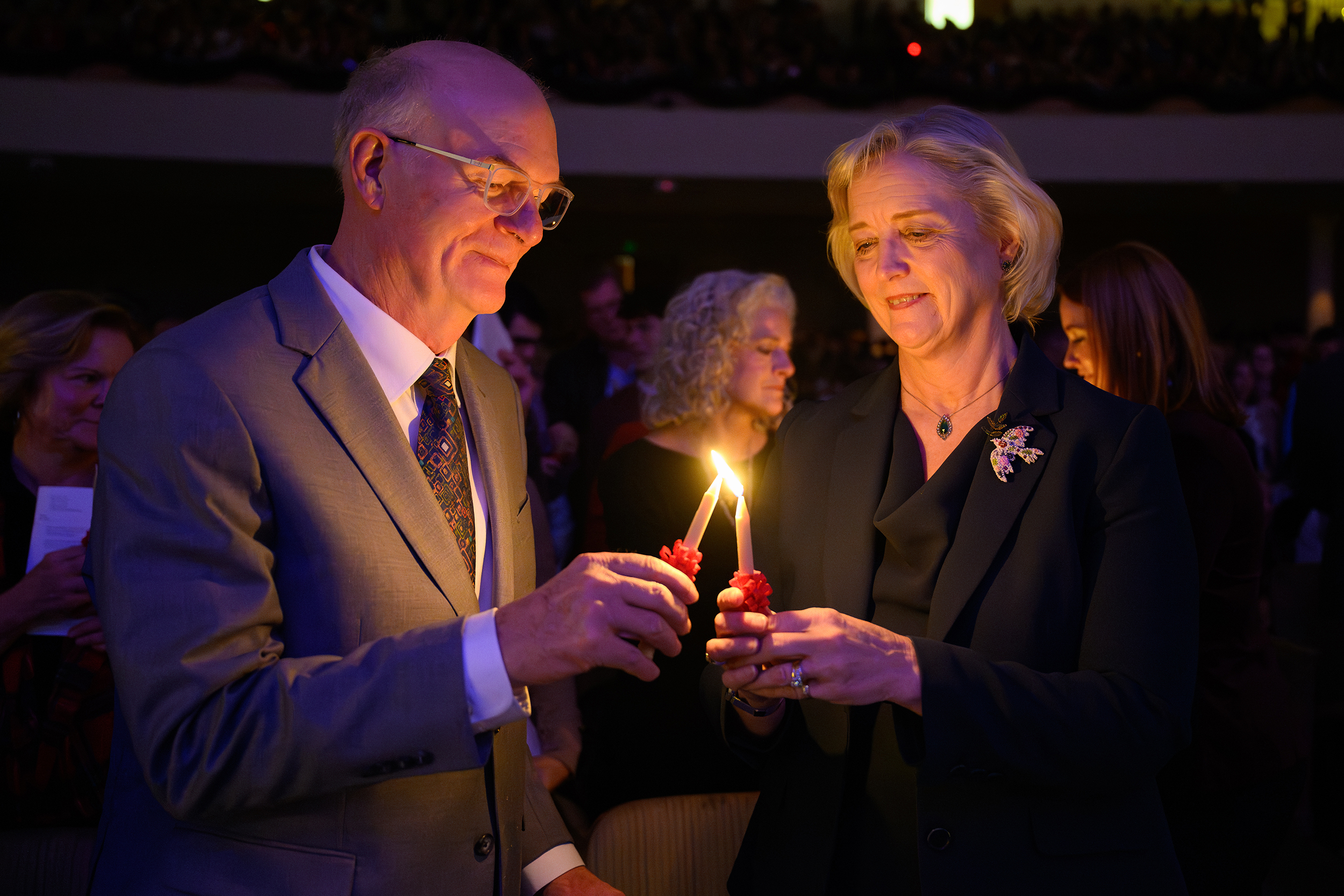 President Wente watches her candle get lit during the traditional Lovefeast ceremony. See her 2023 holiday greetings, and see the Lovefeast photostory below.