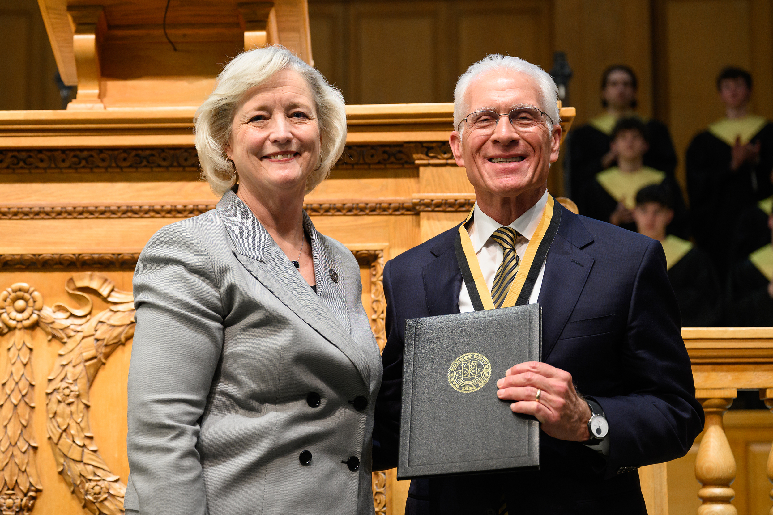 President Susan R. Wente presents Don Flow (MBA ’83) with the Medallion of Merit at Founders Day at Wait Chapel on Thursday, February 20, 2025