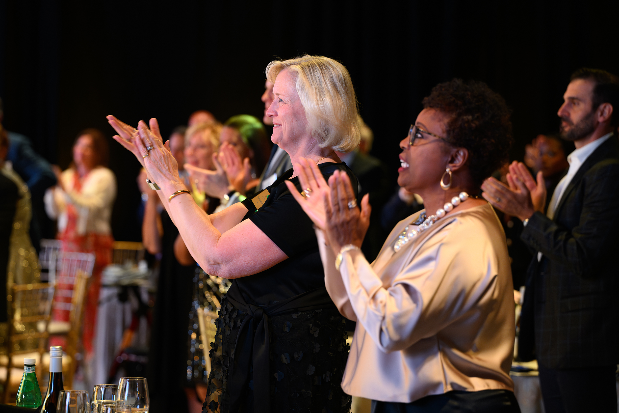 President Wente applauds at the 2025 Distinguished Alumni Awards dinner on Friday, April 25 in the Sutton Center at Wake Forest University. The 2025 honorees are Syd Kitson (’81) and Barbee Oakes (’80, MA ’81).