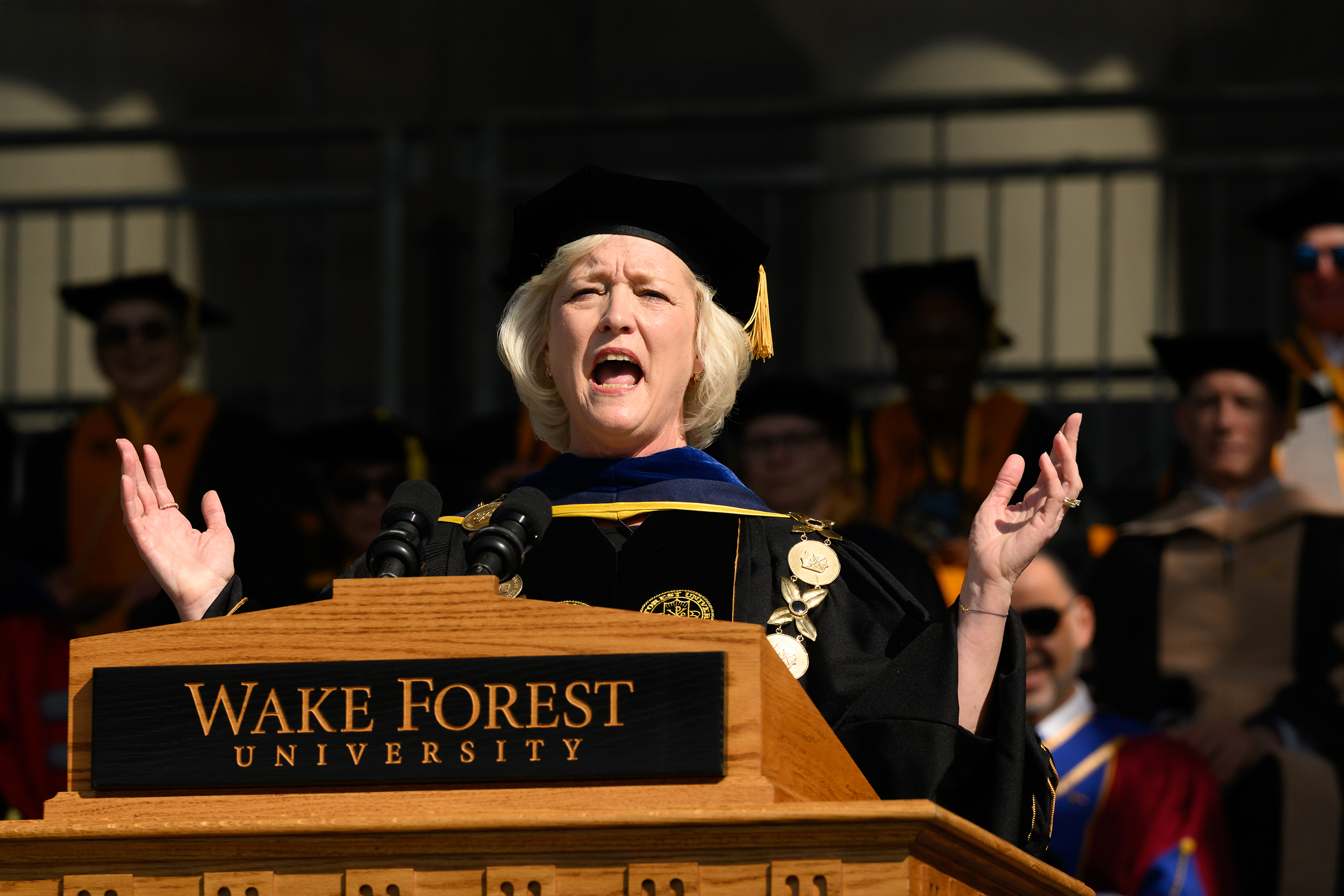 President Wente congratulated graduates at her first Wake Forest Commencement on May 16, 2022, telling them in her address: “You are entering a world that needs your expertise and knowledge, a world that craves your leadership and character.”